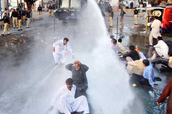 KARACHI - Teachers demonstrate for rights were given a thorough wash by police with water cannons here Wednesday . Police also used tear gas , apparently injured 2 women , a total of 40 protesters were arrested . Teachers have announced boycott of educational activities in schools across Sindh tomorrow (Thursday ) .
